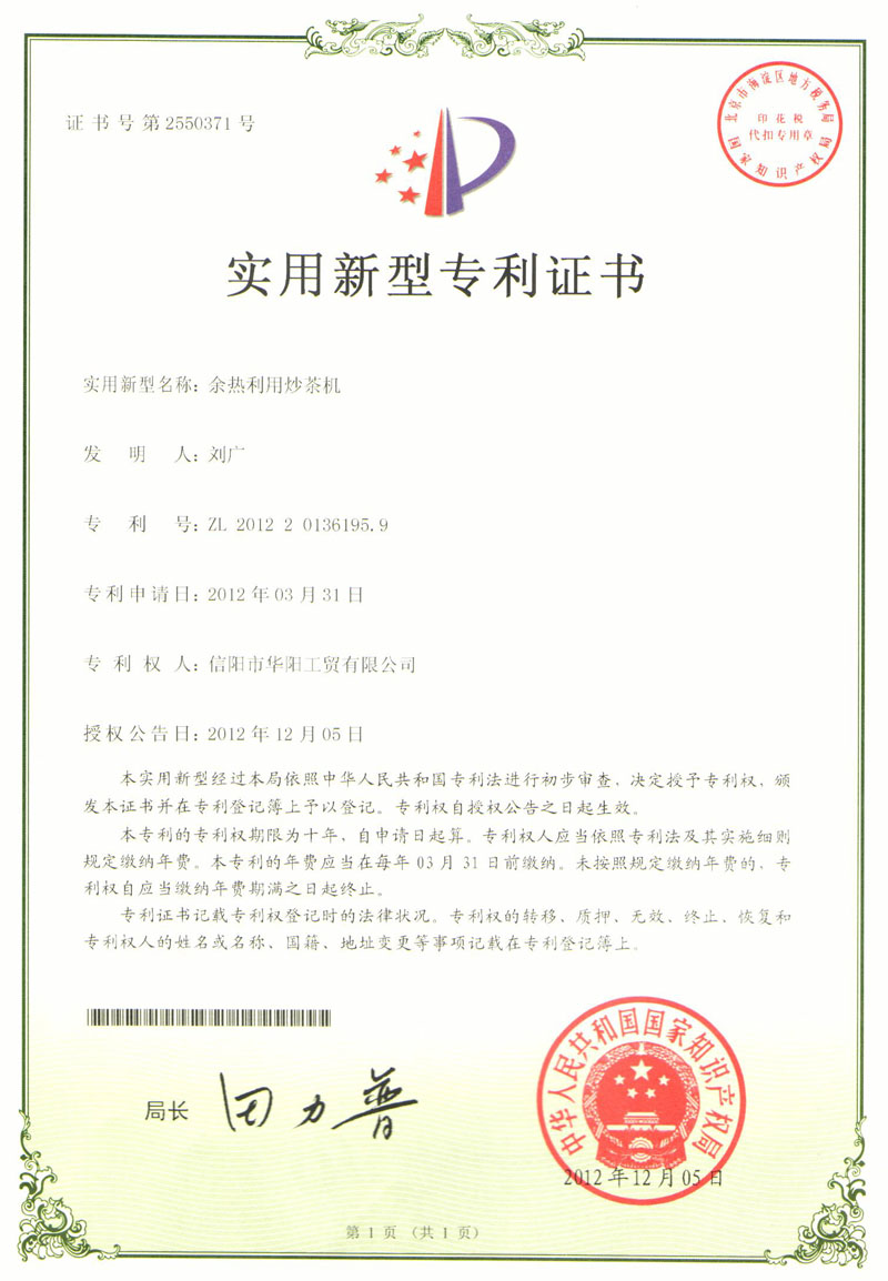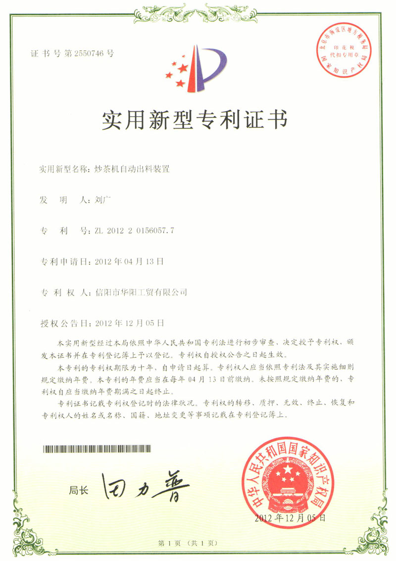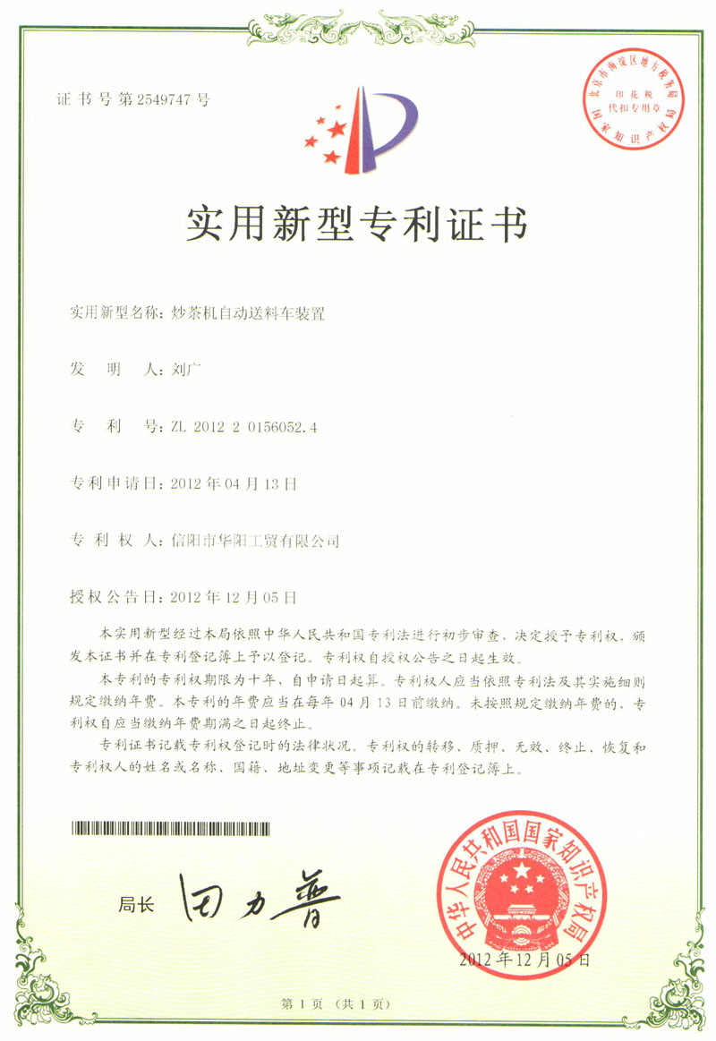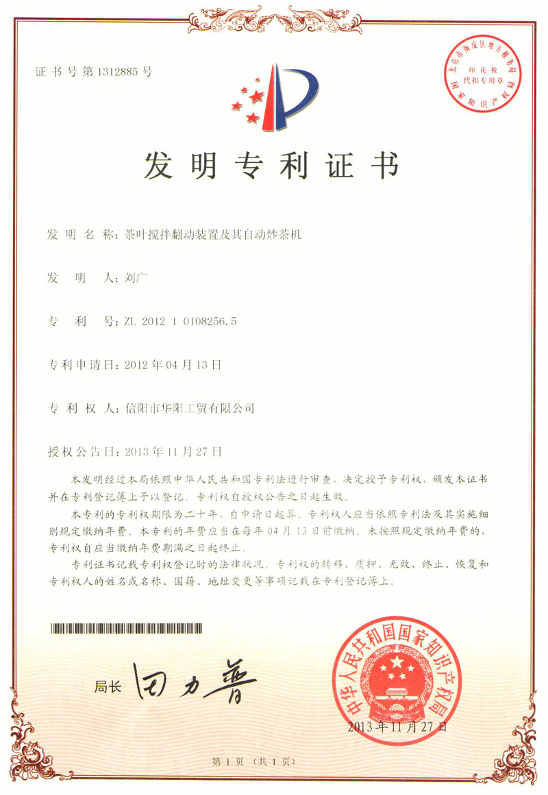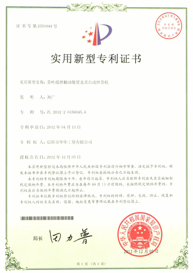 2010年信陽(yáng)紅茶的主研發(fā)人,并研發(fā)出第一臺(tái)箱式自動(dòng)發(fā)酵機(jī)(命名為“紅茶發(fā)酵室”)。